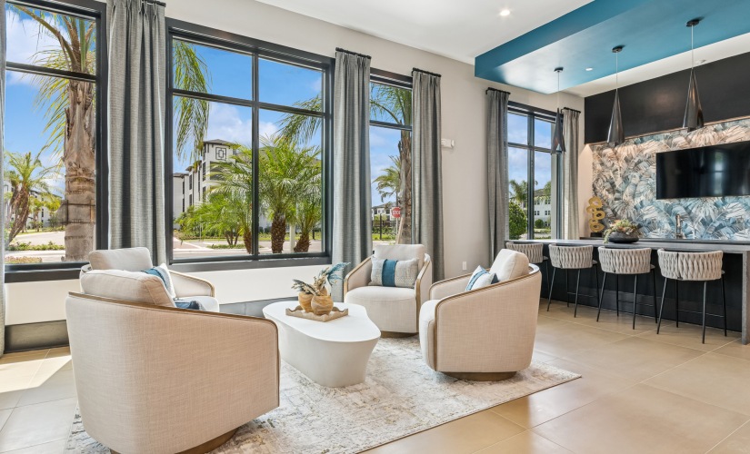 Welcome to Ascend Nona West Two-Bedroom Luxury Apartments in Orlando, FL with In-Unit Washer and Dryer - Ascend Nona West - Resort-Style Saltwater Pool Surrounded by Daybeds, Loungers, and Umbrellas, Trees, Overlooking the Apartments. Take advantage of all Ascend Nona West has to offer Take advantage of all Ascend Nona West has to offer Take advantage of all Ascend Nona West has to offer